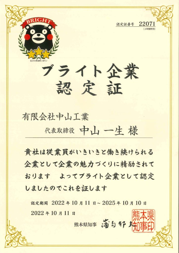 ブライト企業に認定されました。 2023年2月24日 最終更新日時 : 2023年2月26日 nakakou 令和4年度ブライト企業に2022年10月11日付で認定を受けました。『働く人がいきいきと輝き、安心して働き続けられる企業』を継続していきます。
