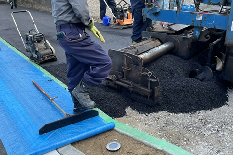 アスファルトを搬入して敷均しをしていきます。この時のアスファルトは150度前後の高温になっていますので、怪我に気を付けて作業をおこないます。温度が低下しない内に一気に敷いて均していかなければなりません。そのため、広範囲に敷けるフィニッシャーという車両を使って敷き均していきます。アスファルトの温度が下がると、転圧の効果も下がってしまいますので、迅速な施工が求められます。